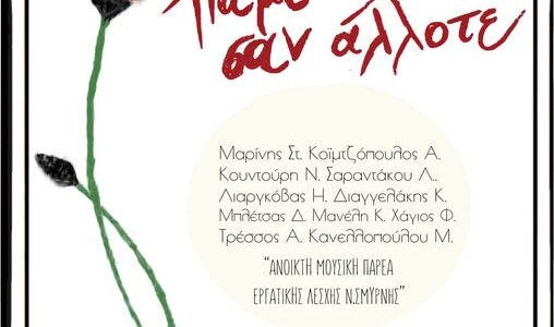 Η Ανοιχτή Μουσική Παρέα της Εργατικής Λέσχης Νέας Σμύρνης, ετοίμασε μια ξεχωριστή μουσική βραδιά με μελωδίες και τραγούδια μεγάλων δημιουργών μιας γενιάς και ενός μουσικού ρεύματος που άφησε ισχυρό αποτύπωμα και ανεξίτηλα ίχνη στην μουσική ιστορία της χώρας μας.